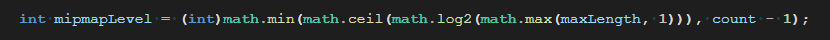 每个物体的深度测试是可以并行进行的,因此借助Unity的JobSystem和Burst优化,可以获得比较好的性能效果。这一步计算物体包围盒投影到屏幕上的AABB矩形,并根据矩形的最长边选取应该从哪一级的mipmap开始做深度测试,选取的公式如下: