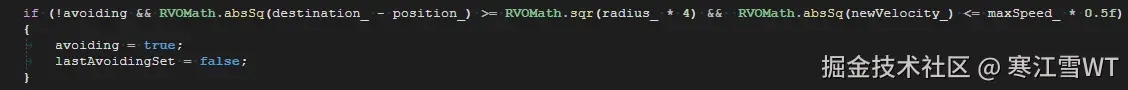 对于正在运动的Agent,触发绕行的条件是当Agent距离目标点比较远,且RVO2算法在解线性规划时,得到的速度小于一定阈值。满足该条件的Agent进入绕行状态。在估算绕行方向时,会记录每一次的绕行方向,因此在首次进入绕行状态时,标记LastAvoiding还未设置。