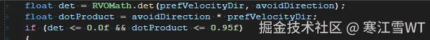 Agent沿着绕行流场运行,何时结束也是一个需要解决的问题。如果仅仅只是判断Agent与目标点的距离小于一定阈值则停止,那么很可能Agent会环绕着静止的Agent运动,因为距离达不到阈值内。而仔细探究这个问题,需要回答的是一个Agent处于绕行状态时,在什么条件下恢复正常行进状态,沿着PrefVelocity的方向前进,并且能持续前进直到无法前进为止。因此可以肯定,是否要结束绕行状态,则要判断沿着PrefVelocity方向前进,是否可能会更好。