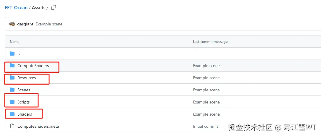代码的目录结构如下,其中ComputeShaders里存着的是FFT和IFFT相关的代码(有一点问题,后面再说)。Resources里保存的是使用的噪声贴图。Scripts里保存的是所有相关的C#脚本,实现了网格生成,ComputeShader的调度和使用等逻辑。Shaders里只有一个渲染海面网格的Shader。