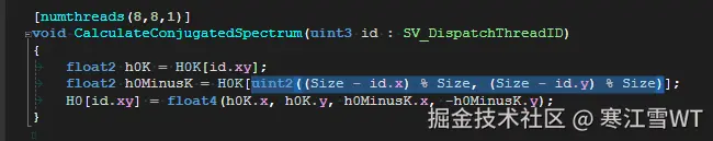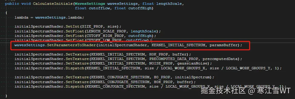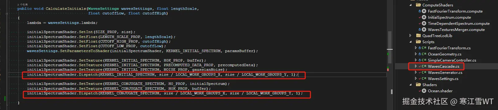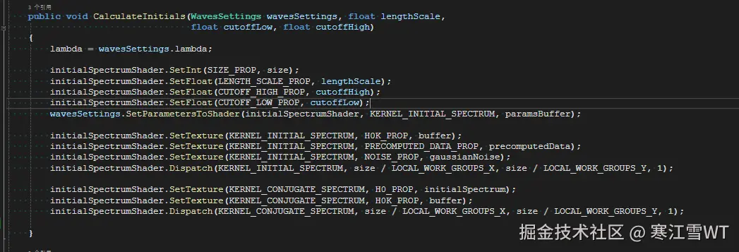 上述所有过程,除了参数配置之外,都在ComputeShader中完成。在 WavesCascade.cs中,可以看到这里对ComputeShader进行了两次调用。第一次是计算h_0(\vec{k}),第二次是计算h_0^*(\vec{k})