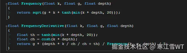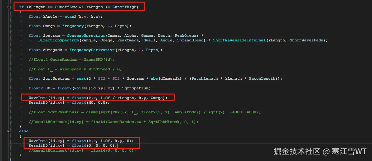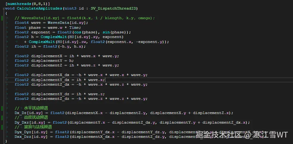 瞬时频谱的计算过程定义在 TimeDependentSpectrum.compute,该过程与上一篇介绍的海面模拟过程一致。不过这份代码计算了更多的内容,我直接标注在代码中,就不介绍了。如果不关心渲染结果,只做海面网格的顶点扰动,可以只看Dx_Dz及Dy_Dxz这两张贴图。
