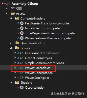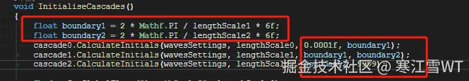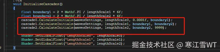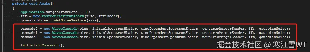 在初始化时,创建了三个WavesCascade类,定义在 WavesCascade.cs中,然后计算初始频谱。