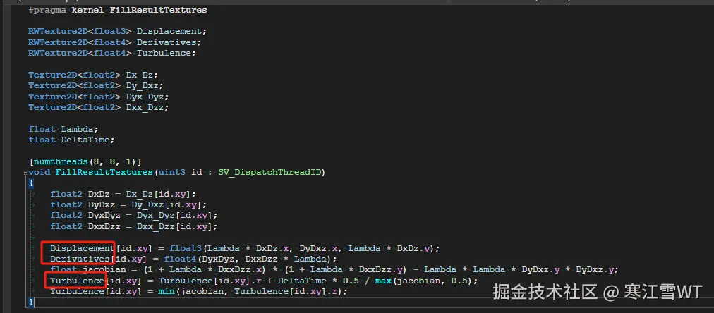 贴图合并的过程,定义在 WavesTexturesMerger.compute中。该过程主要将前面IFFT的结果,合并程三张贴图,标注如下。