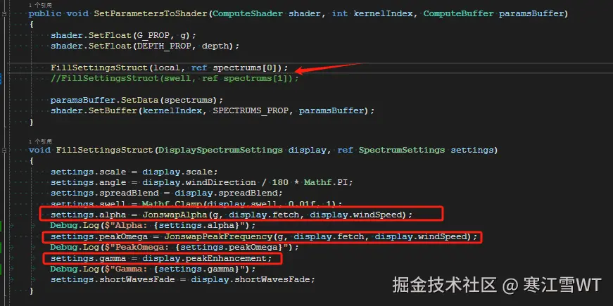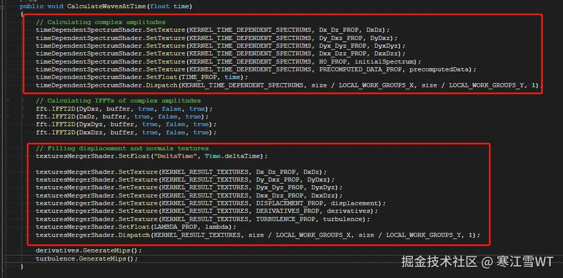 贴图合并和瞬时频谱的计算是一起的,在 WavesCascade.cs中定义,如下图所示的方法中,先计算了瞬时频谱,然后再进行贴图合并。