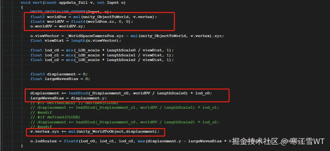 关于海面网格的渲染,和上一篇一样,只展示对Displacement的采样。采样的UV坐标是与顶点的世界坐标有关。而后续具体的渲染方法说不上一二,就不过多介绍了。