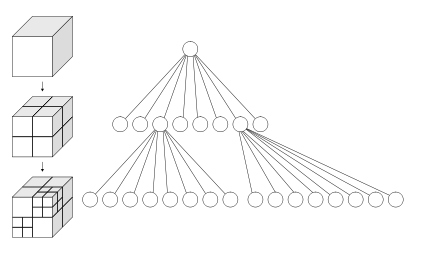 稀疏八叉树与八叉树不同的一点在于,八叉树是完全分裂的,而稀疏八叉树不是。当八叉树的一个节点需要分出子节点时,它的八个子节点都要划分出来,哪怕它里面什么内容都没有。而稀疏八叉树的节点在分裂时,只有当子节点和输入的几何体相交时,才会生成子节点。这样做有一个好处,即稀疏八叉树的节点,都是有内容的,而不在树上的节点,都是没有内容的。这样使用稀疏八叉树对场景进行划分,会比完全划分的八叉树使用的内存更少。